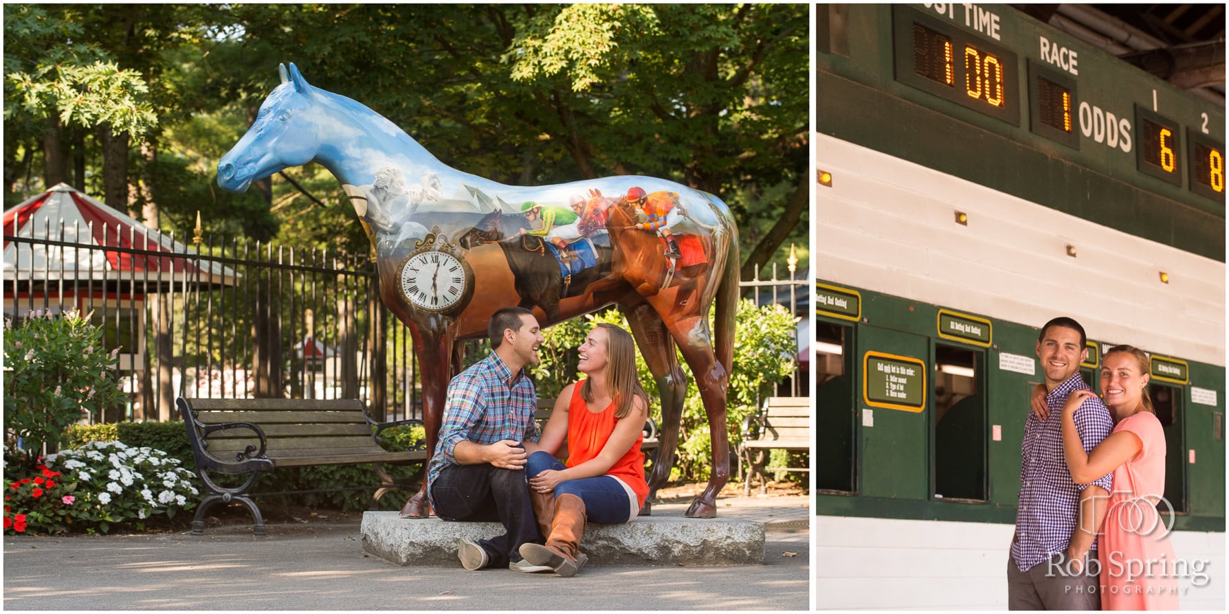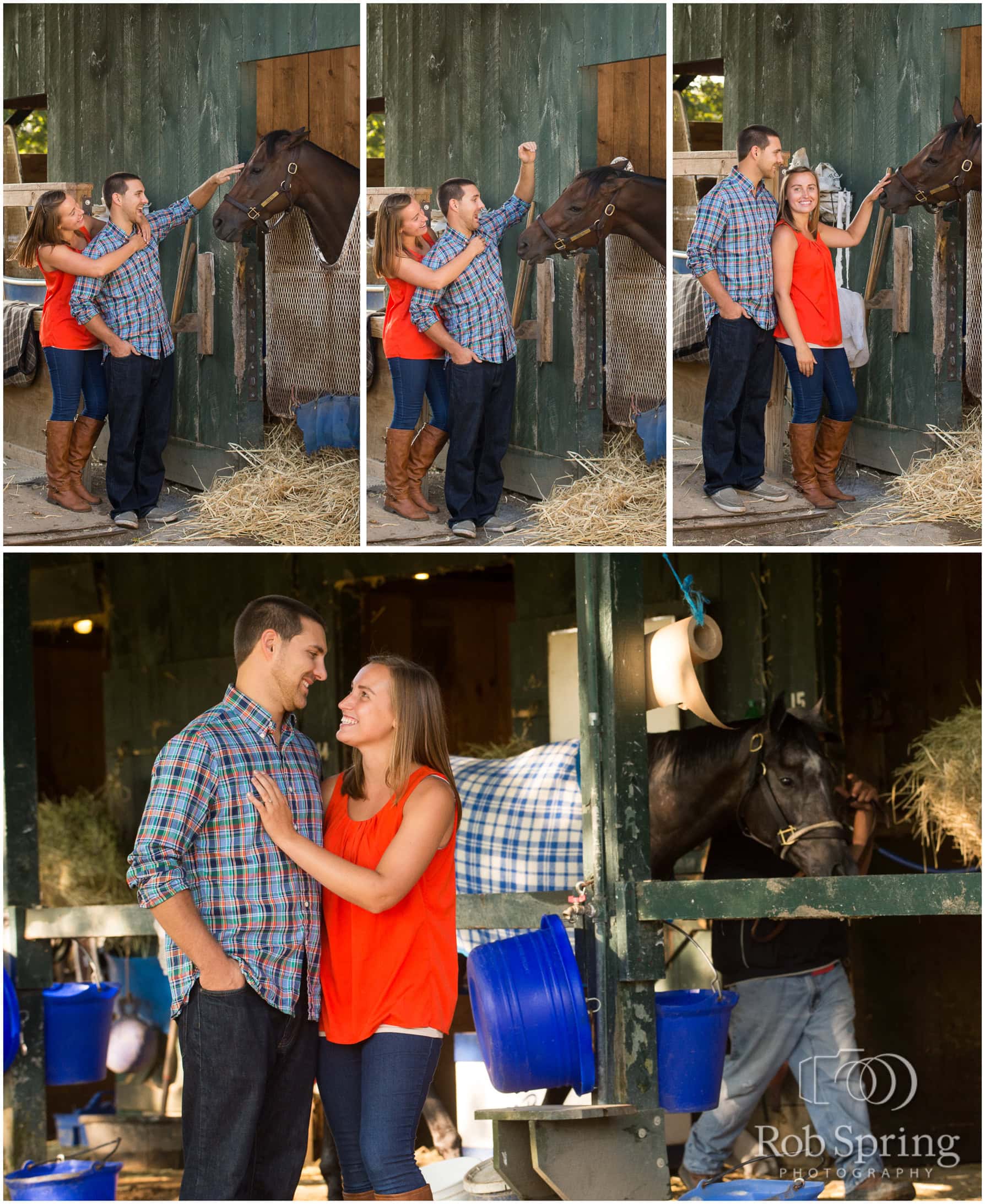 I had so much fun with Kim & Jim for their engagement session the other morning! Kim had a friend that was a trainer so we got a cool behind the scenes look at the barns of the race track. We were accompanied by some pretty awesome guests (except when one tried to nibble on Jim 😉 ). Check out the photos below of our fun morning adventure!